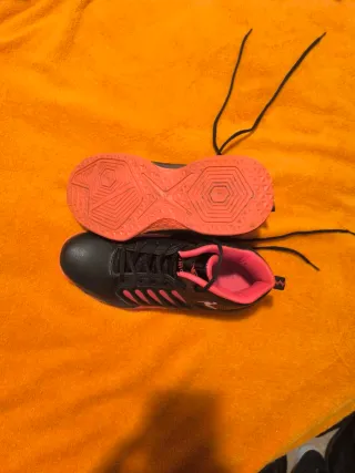 Sneakers da calcio a 5 per bambini con un design accattivante. Usate solo un paio di volte. Sono nuove. - Parte superiore in viola. - Dettagli in verde lime. - Chiusura con lacci.