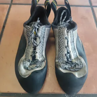 Scarpe da arrampicata La Sportiva Miura Donna in colore nero e grigio. Progettate per l'arrampicata. - Chiusura con lacci. - Numero 38. - Design asimmetrico per maggiore precisione. - Suola appena sostituita con gomma La Sportiva. Punta riparata.
