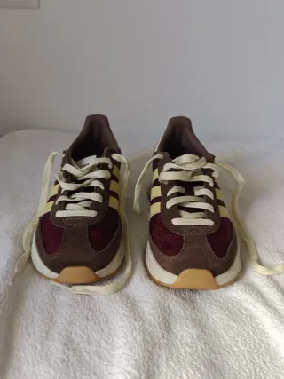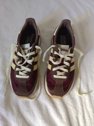 Sneakers sportive in pelle scamosciata color bordeaux con dettagli beige. Taglia 38 un po' stretta. - Design con striscia laterale. - Lacciuoli bianchi. - Suola in gomma marrone.