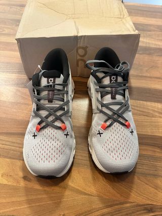 Scarpe sportive da donna della marca On Running. Colore grigio e bianco. Modello Cloud X. Chiusura con lacci. Dettaglio di cuciture color corallo.