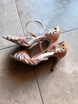 Eleganti scarpe da ballo con strass. - Tacco alto 8 cm e lunghezza interna della soletta 27 cm perciò è un 41 sicuro ; cinturino chi passa dalla suola alla caviglia con doppio giro ed ha la chiusura facilitata - Decorazioni scintillanti su tutta la tomaia. Non manca neanche un brillantino. -Soletta in pelle e suola in bufalina - Design aperto e raffinato. -indossate solo tre volte -solette morbidissime e comodissime