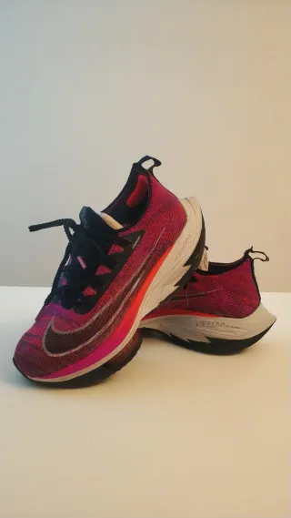Scarpe da corsa Nike Alphafly in vivaci toni rosa e nero. Progettate per offrire prestazioni ottimali. - Parte superiore in tessuto traspirante. - Suola con tecnologia ZoomX. - Chiusura con lacci neri. - Dettaglio swoosh laterale. Indossate solo per 10 km, a mia moglie non piace la sensazione della scarpa durante la corsa. Ideali per percorrere molti km.