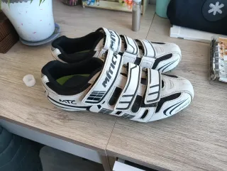 Scarpe da ciclismo MTC con chiusura in velcro. Design sportivo in bianco e nero. Chiusura a tre velcro per un'aderenza sicura. Suola con ventilazione. Pedali per bicicletta.