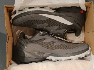 Scarpe da trail running Salomon con tecnologia GORE-TEX. Design in nero e grigio. Suola ad alta aderenza per terreni difficili. Tecnologia impermeabile.