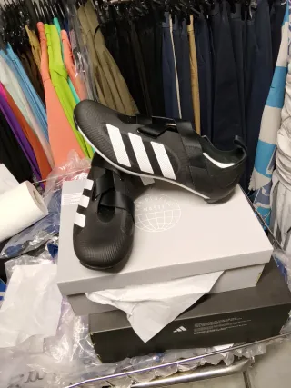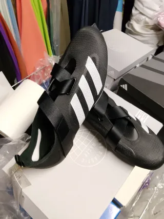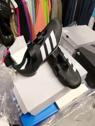 Scarpe da ciclismo Adidas. - Taglia 45./5 - Chiusura con velcro. - Design nero con strisce bianche.