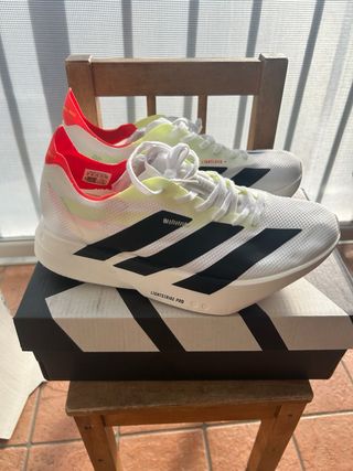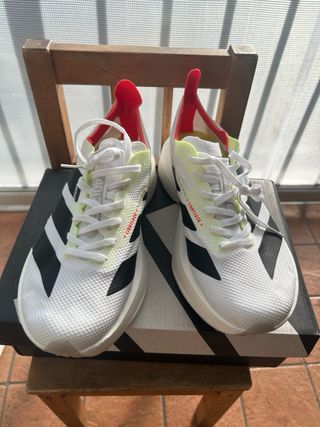 Scarpe da corsa Adidas con dettagli rossi e bianchi. - Tomaia in mesh traspirante. - Intersuola con tecnologia Lightstrike Pro. - Inserti colorati sul tallone e sul collo del piede.