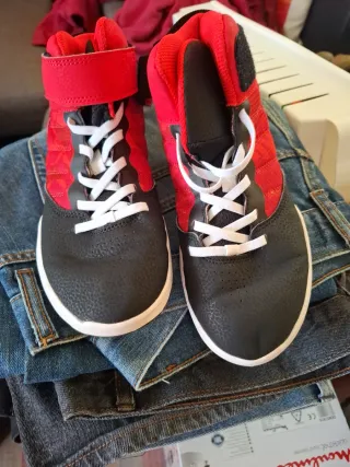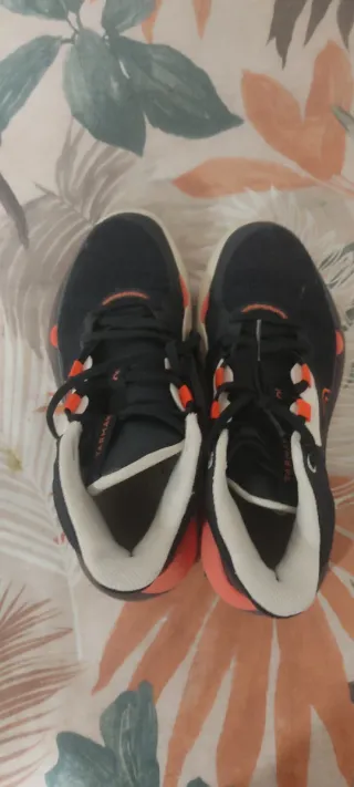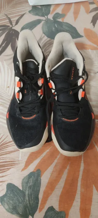 Sneakers da basket Tarmak per bambini in taglia 39, 24,5 cm. Progettate per offrire buona presa e comfort sul campo. Combinazione di colori nero e arancione. Chiusura con lacci. Suola in gomma. Utilizzate solo per due partite.