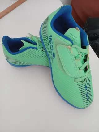 Scarpe da calcio per bambini in taglia 30. Progettate per offrire comfort e buona presa sul campo. Colore verde con dettagli in blu. Chiusura con lacci e velcro.