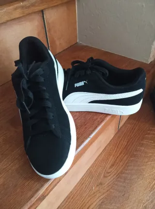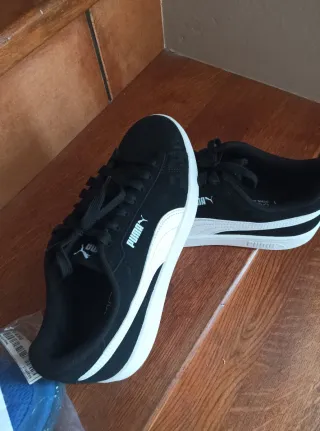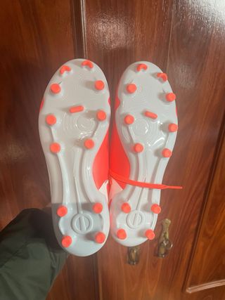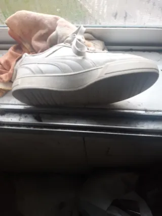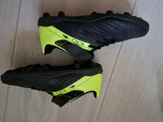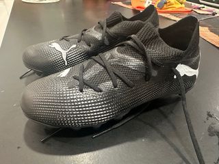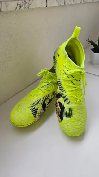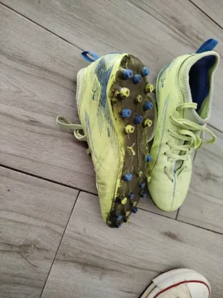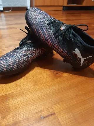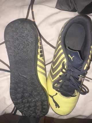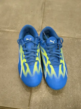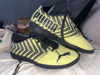 Scarpe da calcio usate 3 volte. Chiusura con lacci neri. Collo elastico per un'ottima vestibilità. Dettaglio del logo Puma in bianco.