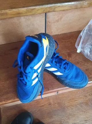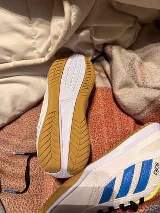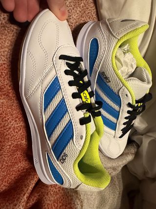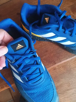 Scarpe sportive Adidas per bambini, ideali per il calcio. Design bianco e blu. Dettagli in mesh traspirante. Chiusura con lacci neri. Suola in gomma. Logo Adidas sul lato. Taglia n35 nuove da indossare.