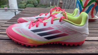 Scarpe da calcio Adidas F50 per bambini, con un design accattivante in bianco e rosa. - Lacci rosa. - Dettaglio a righe nere e gialle. - Suola con tacchetti per erba artificiale.