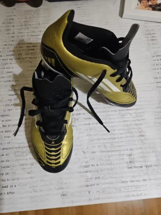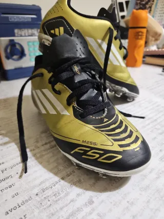 Scarpe da calcio per bambini, taglia 33. Progettate per un buon rendimento sul campo. Modello Messi F50. Combinazione di colori nero e oro.