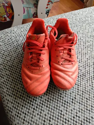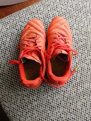 Scarpe da calcio per bambini in colore arancione. Perfette per giocare sull'erba. Chiusura con lacci. Design con cuciture. Materiale sintetico. Sono taglia 34.