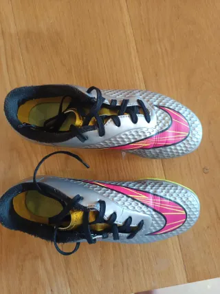 Scarpe da calcio Nike Hypervenom per bambini con un design accattivante - Con tacchetti. Suola progettata per l'erba. - Esterno argentato con dettagli in rosa e giallo. - Chiusura con lacci neri.