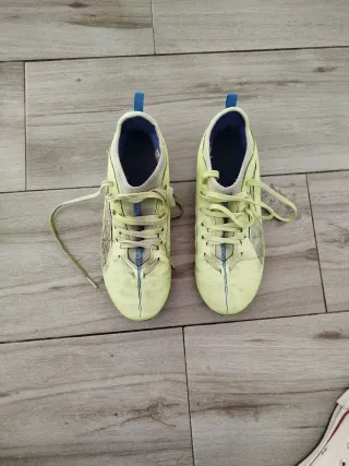 Scarpe da calcio per bambini in taglia 36. Progettate per offrire comfort e prestazioni sul campo. Combinazione di colori giallo e blu. Chiusura con lacci.