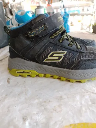 Scarpe sportive Skechers per bambini con suola Goodyear. Design in nero e giallo. Chiusura con velcro e lacci. Dettaglio del logo S di Skechers sul lato. Suola con tacchetti per una migliore aderenza.