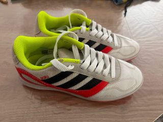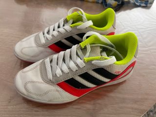 Scarpe sportive Adidas per calcio a 5. Colore bianco con dettagli in rosso e verde lime. Chiusura con lacci rossi. Logo Adidas sul tallone.