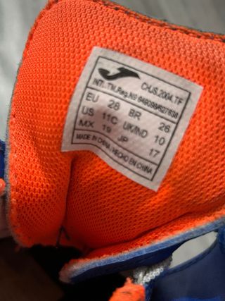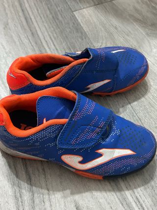 Scarpe da calcio Joma per bambini con chiusura in velcro taglia 28. Design in blu con dettagli arancione. Suola multitacco per erba artificiale o naturale. Logo Joma in bianco.