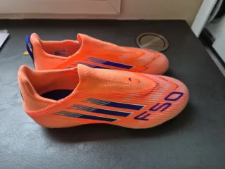 Scarpe da calcio Adidas F50 League LL FG MG in un vivace colore corallo blaze arancione. Design senza lacci per un'aderenza perfetta. Dettagli in blu vibrante. Suola FG/MG versatile per diverse superfici.
