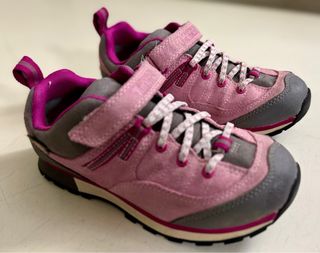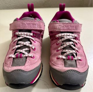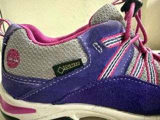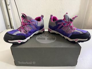 Scarpe da trekking Timberland impermeabili e traspiranti con membrana Goretex per bambini, ideali per il trekking. Plantilla antibatterica Ortolite. Costo originale 75 €. Usate una sola volta, come nuove. - Colore viola e rosa. - Chiusura rapida con lacci. - Suola in gomma adesiva.