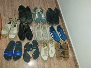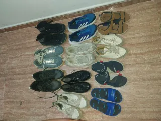 Lot de scarpe per bambini di diversi stili e colori. - Scarpe sportive blu con dettagli bianchi. - Scarpe sportive nere. - Scarpe sportive grigie. - Sandali marroni. - Infradito blu.