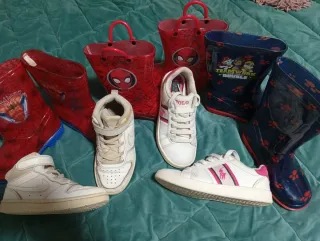 Confezione di calzature per bambini che include scarpe sportive e stivali da pioggia. - Scarpe Nike da alta bota bianche taglia 28 - Scarpe sportive bianche con dettagli rosa Ralph Lauren taglia 30 - Stivali da pioggia rossi con design Spiderman taglia 28 - Stivali da pioggia blu con stampa di impronte e Paw Patrol taglia 28