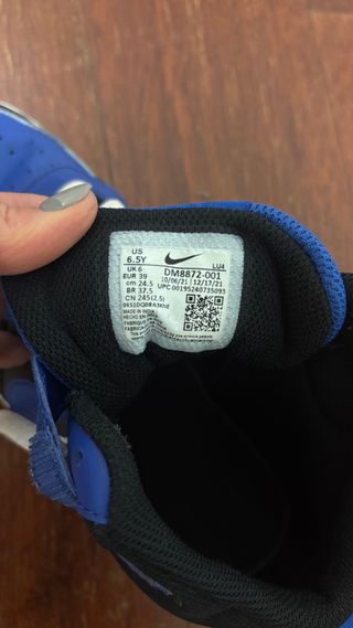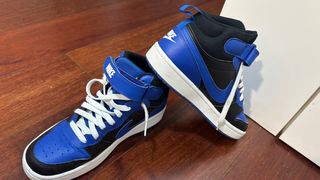 Sneakers Nike Court per bambini in colorazione blu e nero. Dotate di chiusura con velcro e lacci. Design con tomaia alta, logo Nike sul lato e sulla linguetta. Taglia piccola 6.5Y o 39 EUR.