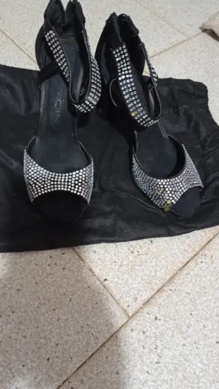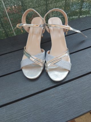 Eleganti sandali da donna con un design scintillante. - Tacco comodo. - Cinturino alla caviglia regolabile. - Dettagli incrociati sul davanti. Indossati una sola volta