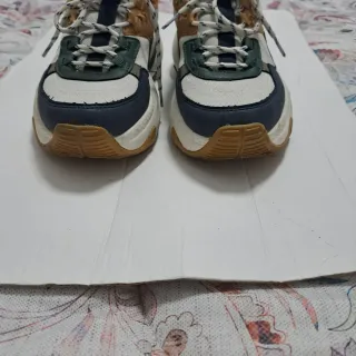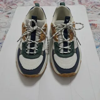 Scarpe da ginnastica da donna con un design moderno e colorato. - Tomaia in tessuto traspirante. - Dettagli in camoscio. - Suola in gomma resistente. - Chiusura con lacci. N.b. il pellame marroncino dove ci sono i buchi dei lacci e un pochino screpolato.