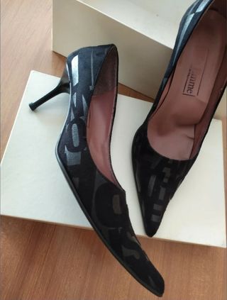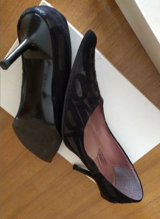 Eleganti scarpe décolleté con tacco comodo. - Fantasia con logo. - Materiale scamosciato. - Made in Italy.