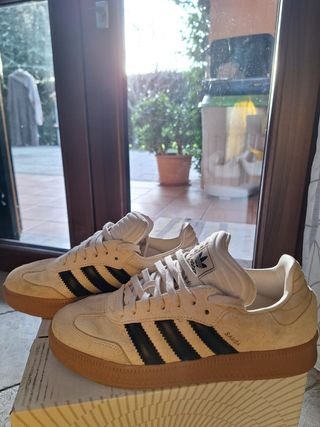 Scarpe Adidas Samba in tonalità beige con dettagli neri. - Design classico. - Suola in gomma. - Logo Adidas sul lato.