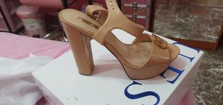 Eleganti scarpe con tacco Guess. - Modello peep toe. - Dettaglio logo dorato sul lato.