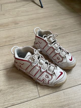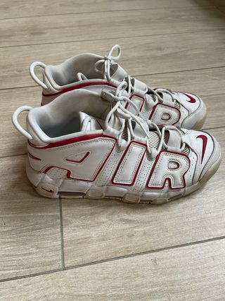 Scarpe Nike Air More Uptempo in pelle bianca con dettagli rossi. Buone condizioni generali, normali segni d’uso. Senza scatola.