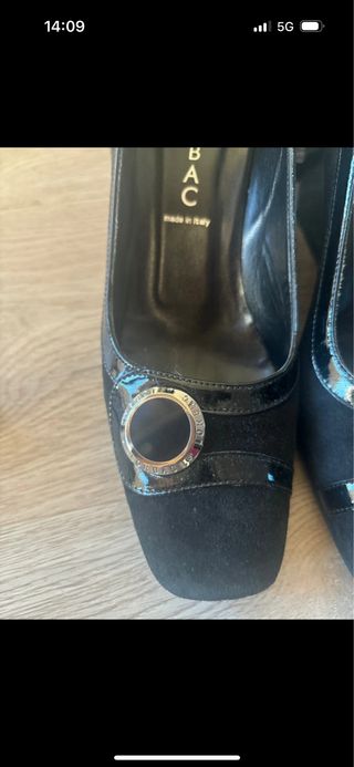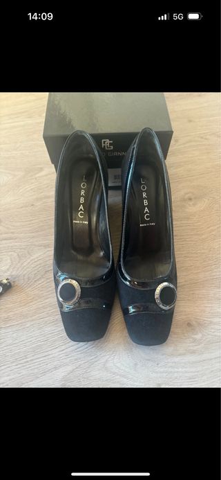 Eleganti scarpe con tacco. - Modello a punta quadrata. - Dettaglio con fibbia metallica e inserto nero. - Rifiniture in vernice lucida e camoscio. - Logo LORBAC stampato sulla soletta interna. - Made in Italy.