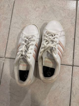 Scarpe da ginnastica Adidas usate, con dettagli in rosa. - Tomaia in materiale sintetico. - Tre strisce laterali. - Chiusura con lacci.
