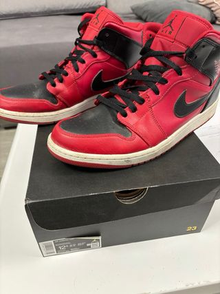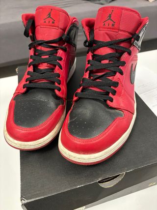 Scarpe da ginnastica alte Air Jordan 1 Mid. - Tomaia in pelle rossa e nera. - Lacci neri. - Logo sulla linguetta. - Suola rossa.