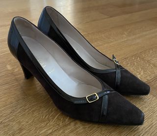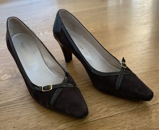 Decolletè con tacco Bruno Magli in camoscio marrone, con profili e tacco in vernice marrone. Dettaglio cinturino con fibbia dorata. Punta affusolata. Taglia 39 IT. Tacco 7,5 cm. Indossate pochissime volte.