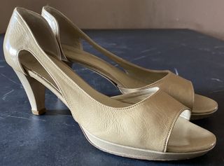 Decolletè da donna in vernice beige. Dettaglio peep-toe. Tacco sottile e slanciato. Design aperto sui lati. Sottile plateau. Taglia 38. Tacco 7,5 cm.