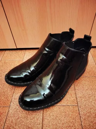Stivaletti alla caviglia, neri, in vernice lucida, con fascia elastica laterale, molto comodi. Numero 39, marca C&A. Dettagli e suole nelle foto. Sono stati indossati pochissime volte, praticamente nuovi. - Dettaglio borchie sul fondo. - Elastico laterale per facilitare la calzata. - Linguetta posteriore per indossarli facilmente.