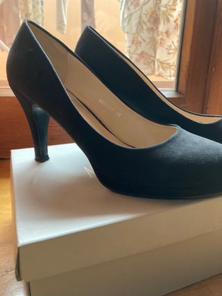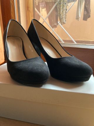 Scarpe scamosciate nere, tacco 9. Poco plateau. Taglia 40. Usate solo un paio di volte. Comode e pianta larga.