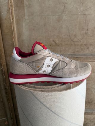 Scarpe Saucony Jazz in tonalità beige con dettagli rossi. - Tomaia in pelle scamosciata e nylon. - Inserti laterali bianchi a contrasto. - Suola in gomma resistente.