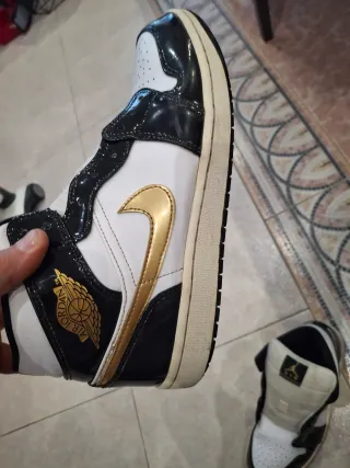 Scarpe Nike Air Jordan 1 Mid con dettagli in vernice lucida. - Tomaia in pelle bianca. - Inserti neri lucidi. - Swoosh e logo Wings dorati. - Suola in gomma.