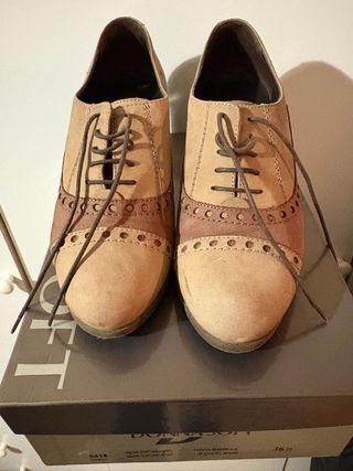 Eleganti scarpe con tacco medio, perfette per completare il tuo look. - Design bicolore in beige e marrone. - Dettagli traforati. - Chiusura con lacci.