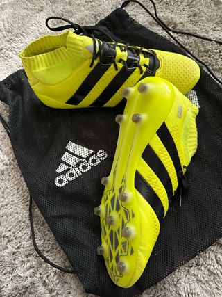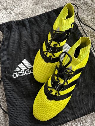 Scarpe da calcio Adidas con tomaia Primeknit. - Colore principale giallo con dettagli neri. - Calzata aderente e confortevole. - Suola con tacchetti per campi in erba.