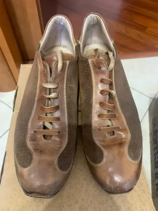 Scarpe utilizzate solo 2 volte. Sono in camoscio color cuoio. Tacco grosso 7. Presentano sulla fascia dorsale fibbia decorativa nera con contorno color oro più, dal lato opposto, inserto elasticizzato.