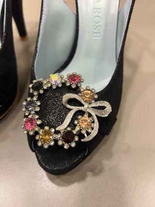 Eleganti scarpe slingback con tacco alto. - Decorazione floreale con strass e fiocco. - Tessuto glitterato nero. - Cinturino regolabile alla caviglia.