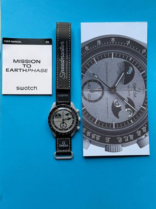 Orologio Omega x Swatch Mission to Earthphase. - Quadrante con dettagli ispirati alla Terra. - Cinturino in velcro con logo Swatch. - Logo Omega sul cinturino.