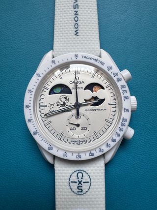 Orologio Omega x Swatch, modello Earthphase con dettagli in Moonshine Gold. - Cinturino in tessuto bianco con logo. - Quadrante con grafica a tema lunare e Snoopy. - Lunetta tachimetrica.