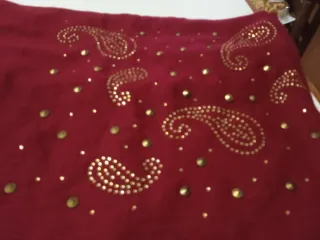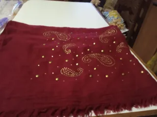 Sciarpa elegante color bordeaux, arricchita da dettagli luminosi. - Decorata con borchie e pietre. - Design con motivo paisley. - Orlo con frange.