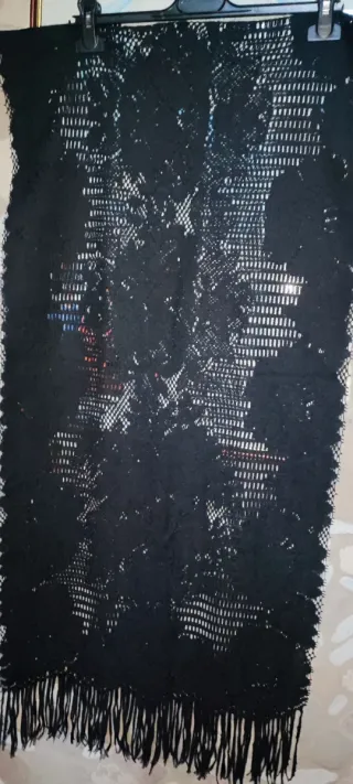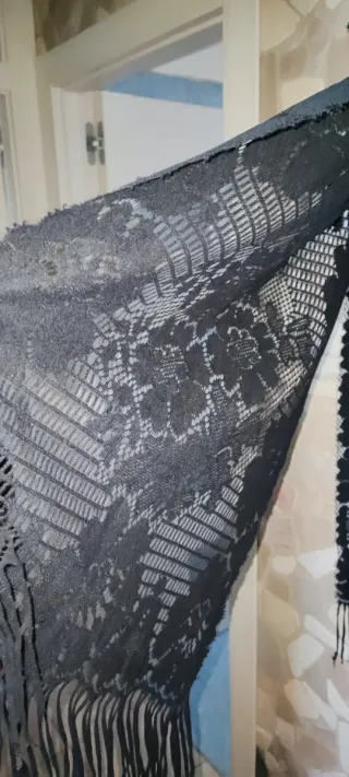 Elegante sciarpa da donna con dettagli raffinati. - Bordi con volant e inserti in pizzo. - Frange decorative alle estremità.